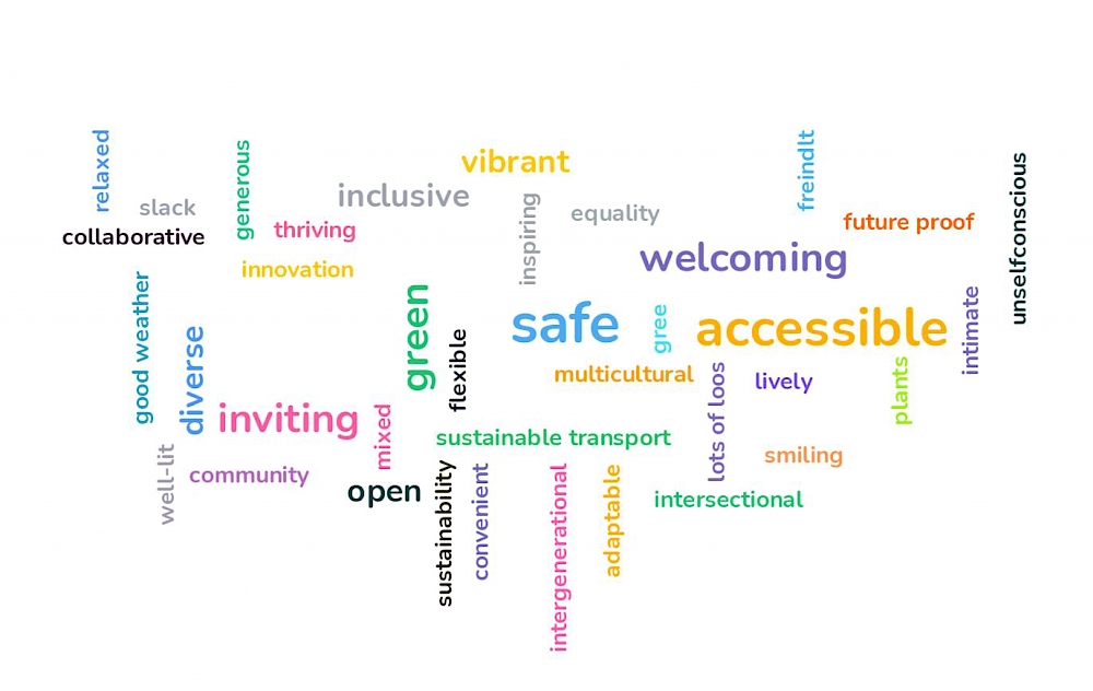 Suggest up to three words that describe an inclusive and connected 15-minute city