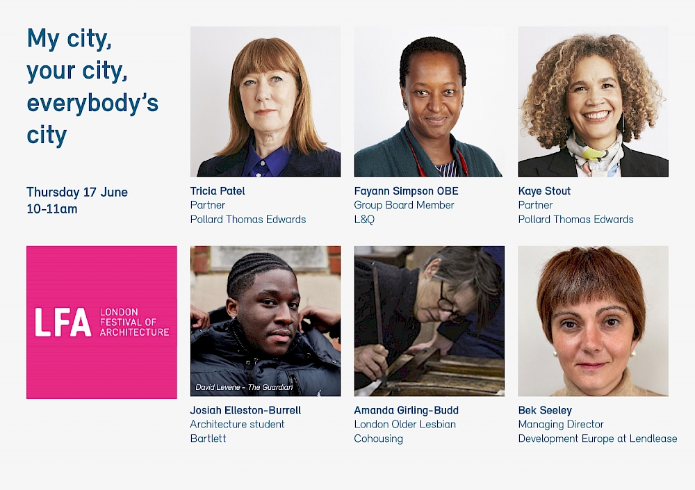 Setting the tone, event chair and PTE partner Tricia Patel said “a city for everyone would promote civic engagement, engender a sense of belonging and ownership among all inhabitants” before introducing five guest speakers: Fayann Simpson, chair of L&Q’s Resident Services Board, PTE partner Kaye Stout, Bartlett student Josiah Elleston-Burrell, Amanda Girling–Budd of the London Older Lesbian Cohousing (LOLC) and Bek Seeley, managing director of development at Lendlease Europe.
