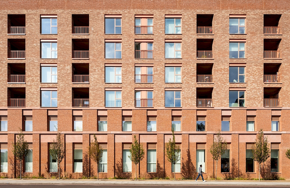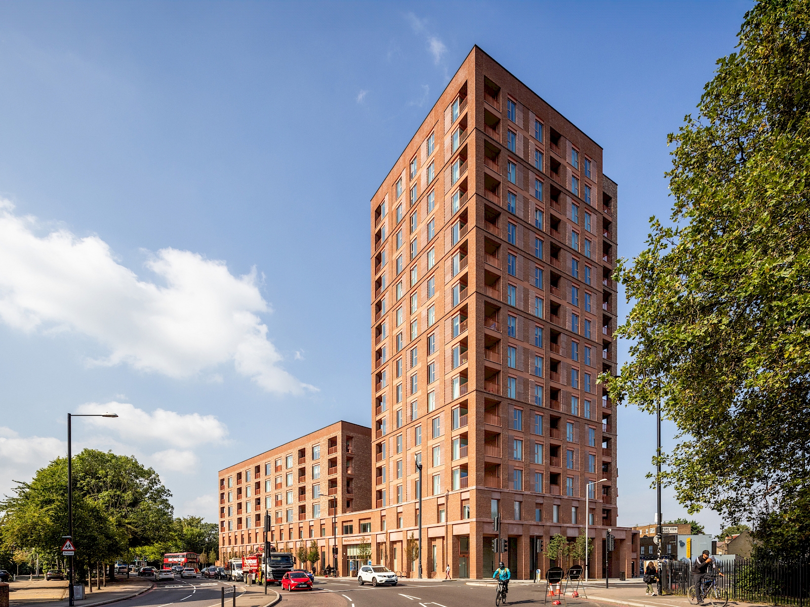 In Tottenham, Walter Tull House provides 131 new council-rent homes above a large GP health centre serving more than 40 doctors. The scheme responds to its busy urban setting with a robust, mixed-use design and rooftop gardens offering panoramic views across London.
